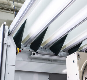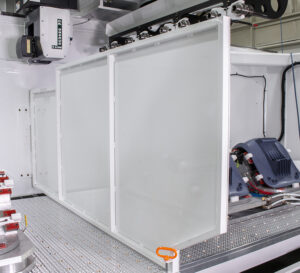 Covers the top section of the machining center to contain debris from the cutting process. It can retract to give you unobstructed access to a forklift or overhead crane and it can adjust with the movement of the Q-Series’ gantry. - Optional Central Partition